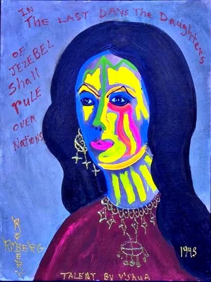 “In the last days, the daughters of Jezebel shall rule over nations,” warns the scrawling inscription that surrounds the face of Jezebel in this 1993 painting by American folk artist Robert Roberg. The apocalyptic message seems to associate the Biblical queen with the “mother of whores and of abominations” who “rules over the kings of the earth” and who has committed fornication with them (Revelation 17:2, 5, 18).